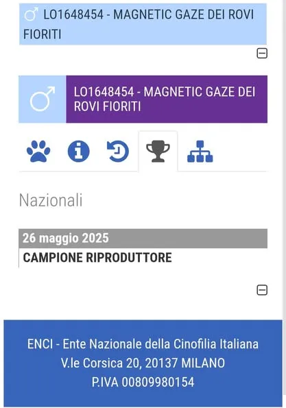 papĂ delle nostre cucciolate "E", "I" e "M" del nostro allevamento ha ottenuto il titolo di "Campione Riproduttore" grazie ai successi dei suoi figli alle esposizioni di bellezza.
